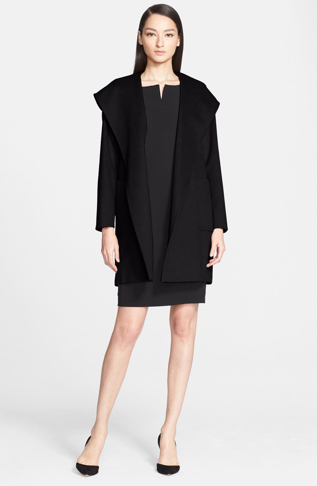 Tailored from sumptuously soft camel hair, this timeless coat features wide shawl lapels that drape into a generous, cozy hood.