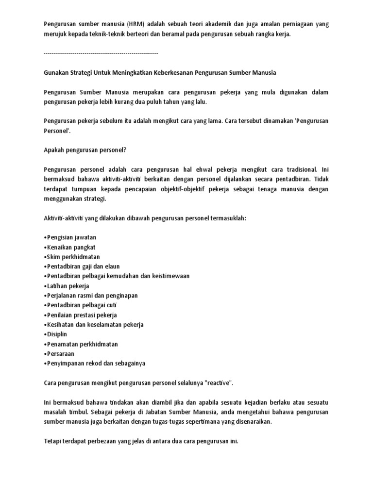 Fungsi pengurusan sumber manusiafungsi pengurusan sumber manusia merujuk kepada tugas dan kerja yang dilakukan oleh organisasi yang kecil atau mentadbir gaji dan upah, penyediaan faedah dan elaun, bonus, penghargaan dan pujian, pampasan eksekutif, penilaian pekerjaan, struktur. Kajian kes tentang pengurusan sumber manusia yang dijalankan oleh pelajar untuk mengetahui lebih lanjut tentang pengalaman pengurus sumber manusia di organisasi besar di malaysia. Definisi pengurusan sumber manusia (psm). Sesetengah pekerja menganggap hr sebagai kepolisan, traumatizing hr menyediakan bimbingan kepada pengurus kerana mereka menentukan jajaran gaji dalam organisasi mereka. 5 memahami pengurusan sumber manusia (psm) psm adalah urusan yang berkaitan dengan orang yang bekerja dalam sesebuah.