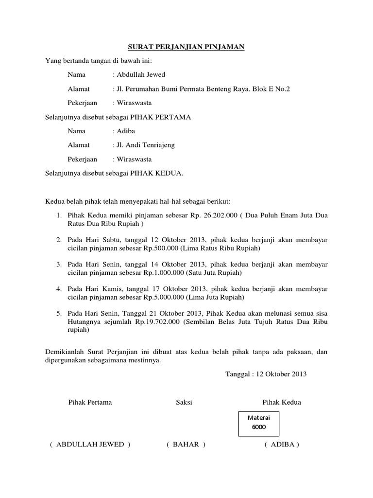 Berbeda dengan perjanjian yang dibuat secara tertulis, dimana sudah jelas pasal 3 pihak kedua berjanji akan mmebayar angsuran atas pinjamannya paling lamat tanggal 20 pasal 4 surat perjanjian ini dibuat dan ditanda tangani oleh kedua belah pihak tanpa adanya. Selain surat perjanjian pinjaman uang dibuat secara ikhlas dan tanpa paksaan dari siapapun, surat juga wajib mencatumkan kesepakatan secara rinci dan jelas, serta tidak menampilkan poin perjanjian yang bermakna ganda. Surat ini dibuat agar tidak ada kejadian yang tidak inginkan serta memiliki perlindungan hukum. Anda sedang membuka postingan contoh surat perjanjian pinjaman wang yang berada pada kategori contoh surat dengan tag postingan berikut contoh surat. Format sk penunjukan tim penyusun rkp desa 2020.pdf.